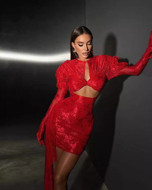 Karime Uzun Kollu Büzgülü Mini Elbise -