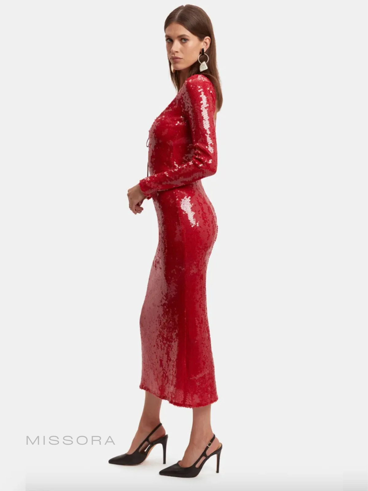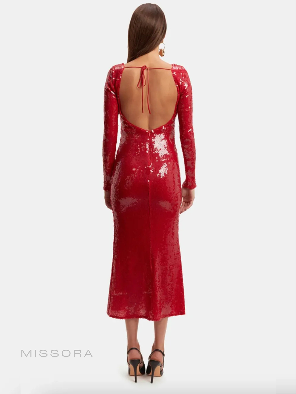 Nil Payetli Sırt Dekolteli Midi Elbise