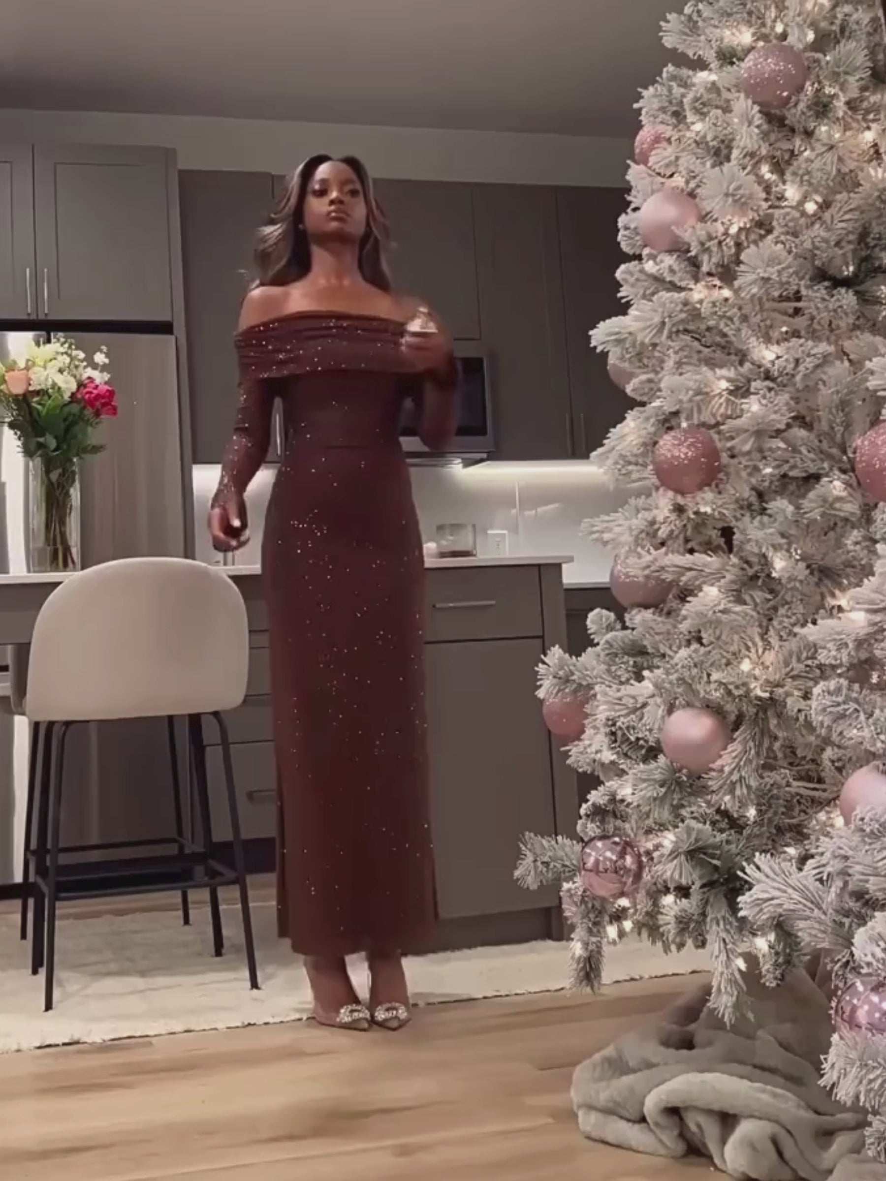 Yanely Işıltılı Düşük Omuz Maxi Elbise